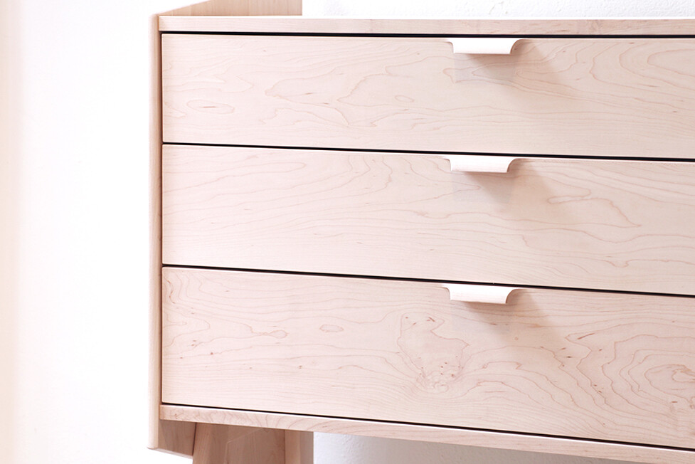 유연한 쉐입의 손잡이와 하드웨어의 부드러운 움직임이 매력적인 서랍장입니다.
