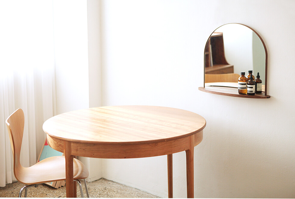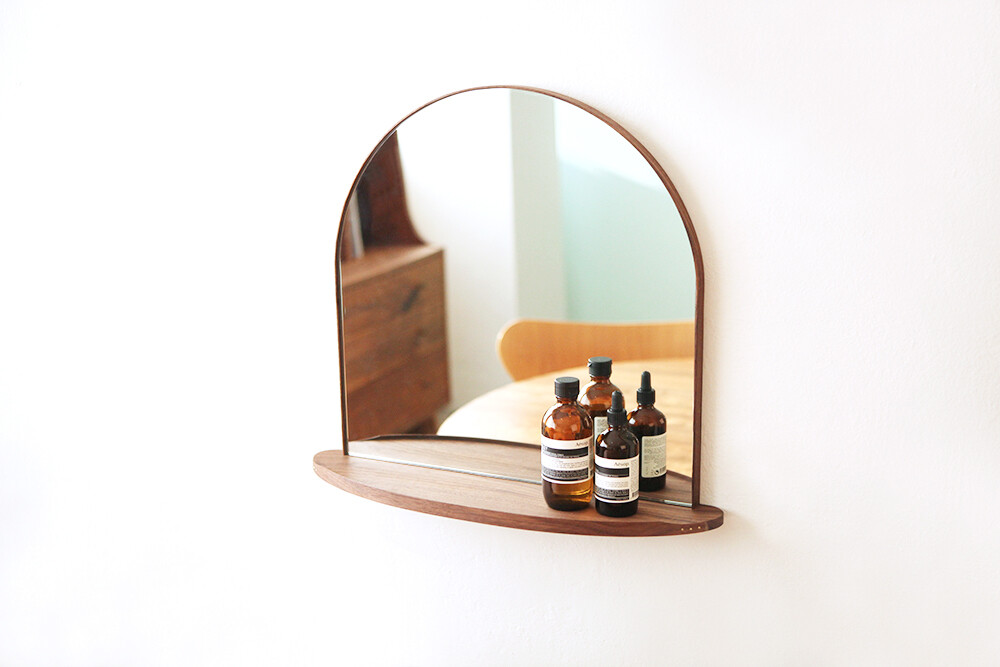 라운드 선반이 부착된 벽걸이 거울입니다.